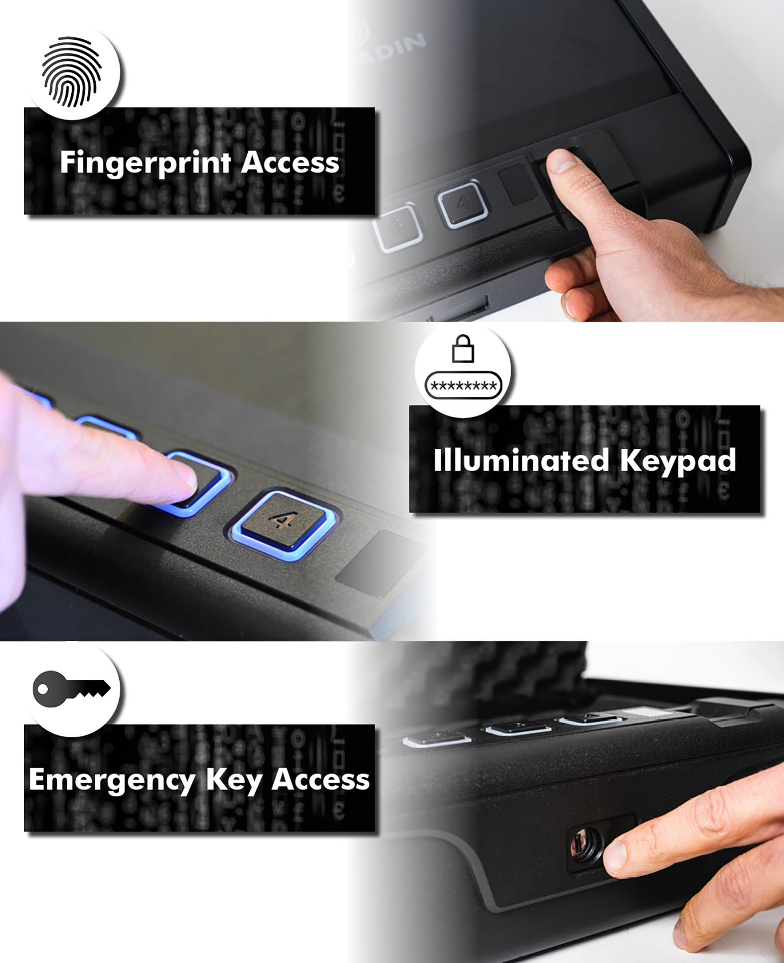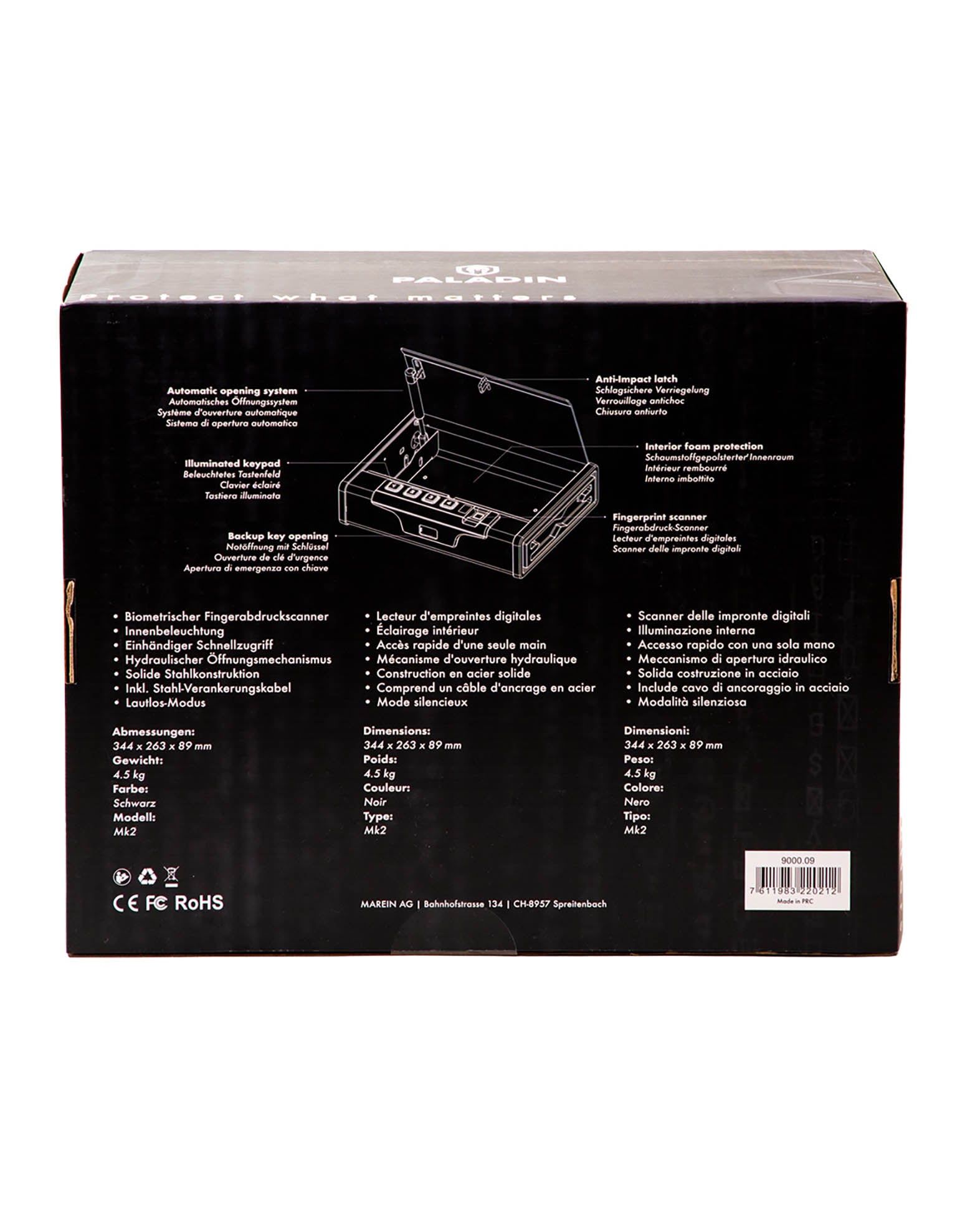 Dank Schnellzugriff per Fingerabdruck (Reaktionszeit <0,5 s) und automatischer Gasfeder-Öffnung haben Sie im Ernstfall sofort Zugriff – ideal für den Heimschutz. Zusätzlich lassen sich bis zu 20 Fingerabdrücke, eine PIN-Kombination oder ein Notfall-Schlüssel nutzen.
